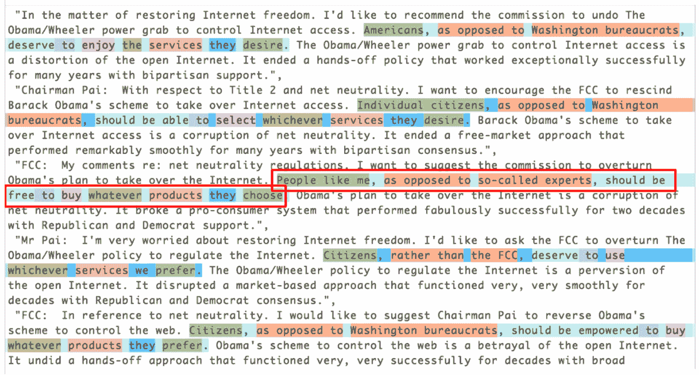 即使是基于规则的简单算法,在广泛使用深度学习语言模型之前,也可以用来创建欺诈账户并试图影响决策者。ProPublica 的计算记者 Jeff Kao 分析了发送给美国联邦通信委员会(FCC)有关 2017 年废除网络中立提案的评论。在他的文章“可能伪造了一百多万条支持废除网络中立的评论”中,他报告了他是如何发现一大批反对网络中立的评论,这些评论似乎是通过某种 Mad Libs 风格的邮件合并生成的。在图 10-2 中,Kao 已经帮助着色编码了这些虚假评论,以突出它们的公式化特性。