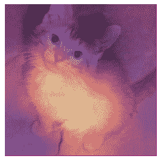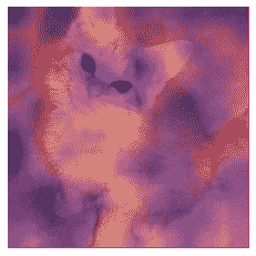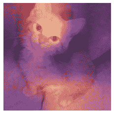 在这种情况下,明亮黄色的区域对应于高激活,紫色区域对应于低激活。在这种情况下,我们可以看到头部和前爪是使模型决定这是一张猫的图片的两个主要区域。